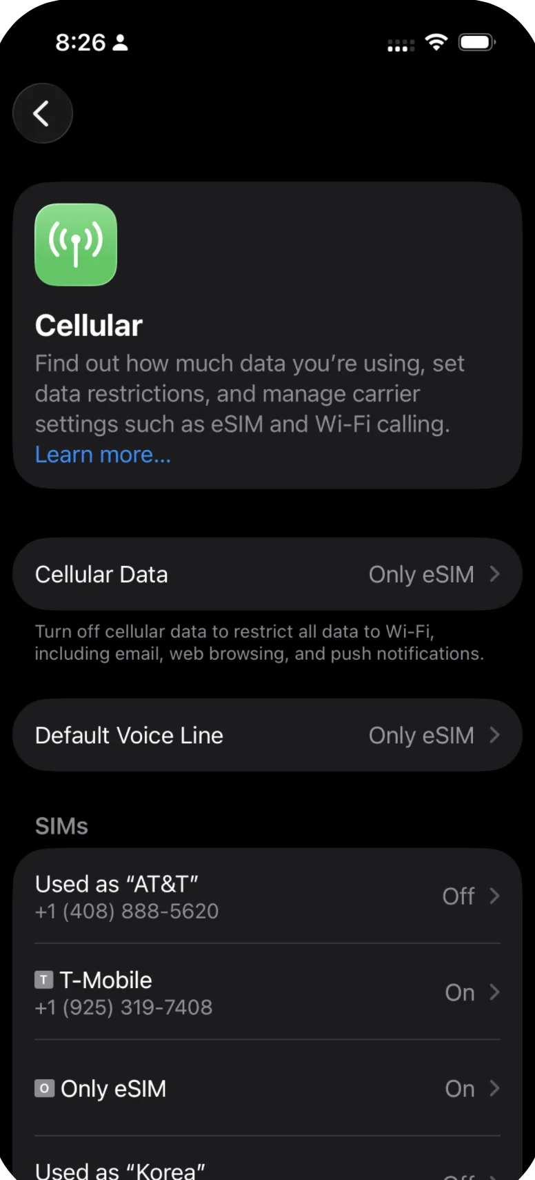 Verify your eSIM shows as "On" in the SIMs list.